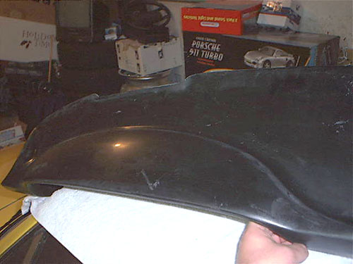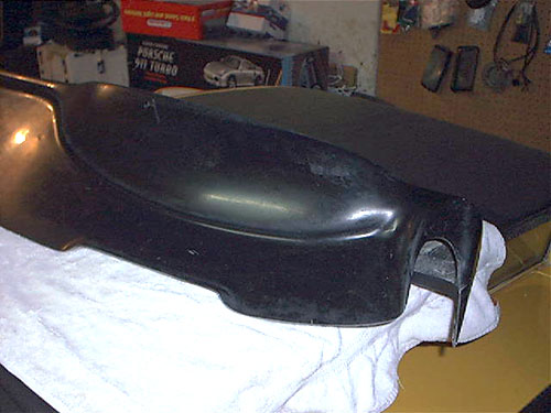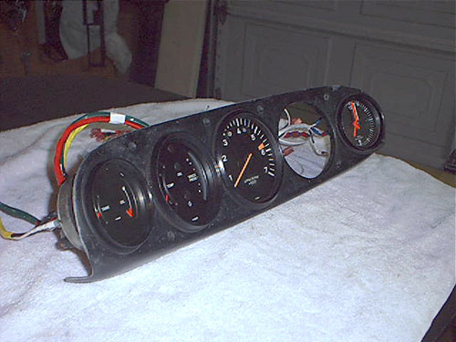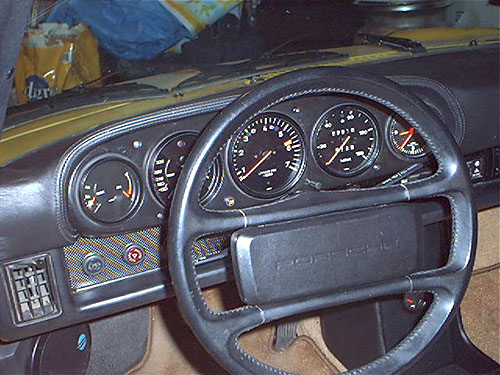 A. Landt February 16, 2004 This is a collection of pictures and information for anyone who is interested in a more functional, better looking 911 style dash for their Porsche 914. A while back I started to look for information and found very little. So I decided to just "Go for it" and see what happens. My 914 dash was very cracked. Though I had a nice dash cap on it, I still wanted to fix the cracked dash. 914 dashes that are not cracked can be quite expensive. I noticed information on a company called "Getty Design" that did a fiberglass 914 dash that looked just like a 911 dash. Since I am not an "Originality" freak I really liked the idea. Once I get the dash it will need finishing. I have a great local upholstery place that does excellent work. He was able to perfectly cover the dash in leather with hand stitching for $375. He told me he could have done it in vinyl for $150. But If I am going this far, it has got to be done in Leather. The 914's three gauges are a perfect fit on the 911 dash. So I knew I could keep the Speedometer and Tachometer. The fuel/temp gauge would fit just fine, but I wanted the 911 temp/oil pressure gauge. I noticed that the 911 fuel level sender is identical to the 914s. So the fuel gauge of the 911 should be a direct fit and work perfectly. Then I would also need a clock. Hey I like the 911 clock. I can retrofit the oil pressure gauge with my smaller VDO unit and make that work, just like I had done with the Temp gauge in my 914 before. VDO gauges are all great, they use the exact same parts and are customizable very easy. So swapping gauges to match senders is a snap. The only gauge I do not need is the oil level gauge. Maybe I will retrofit it for a volt meter. But for now I will ground a 100 ohm resistor to its sensor prong and make it look like it functions. The final costs of my extra gauges and retrofitting came to $150.00. So the final cost of this addition came out to just a little over $850. Not bad for the end results. If I had done in in vinyl and gone with cheaper gauges it would have only cost around $500.