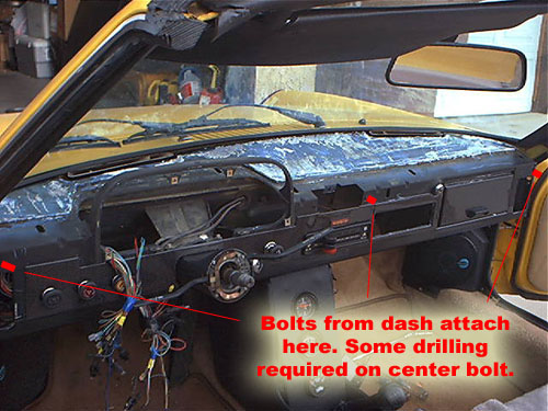 After a bit of stretching and bending I was able to get the original 914 dash out. The hardest part was the three tiny screws that hold the ash tray on. Those suckers are hard to get at. Even harder than the 914 dash mount nuts. I did not want to cut it off so I worked at it, bled a bit and finally got it off in one piece. After a quick test fit I noticed that it went in perfectly and fit perfectly, even with the windshield still installed. I noticed that there were three perfect places that the getty dash lined up with that had holes on the 914's dash plate. I decided that I would drill three holes in the getty dash and insert self locking bolts. These are the bolts that dig into one side so you can tighten a nut to the other side without having to hold it. Trust me there is no way to do it any other way that I could see. I had no idea how I would attach the windshield side. But once I tested with the three bolts in the front, I noticed it was very solid. So I took it out and put in some really sticky double sided molding tape to the dash near the windshield and re bolted it into place. This dash is not going to move. I have read a few places that people find the gap below the passenger side of the dash odd. You can reach up and under the dash in this area, but you cannot see it unless you turn upside down and look up or are 2 feet tall. Actually I noticed that is it nessessary so you can lock the glove box and get to the radio. As well when installing the dash, that open area was a blessing. It made attaching the dash so much easier.
