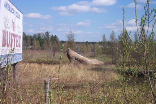 We got a tip here at the paper from one of the librarians who was wondering what was the story with the big shoe barely visible on Trout Road. The editor asked me to get a photo and we questioned our resident Dells history expert, Janice Luete, what her guess was about the big shoe.