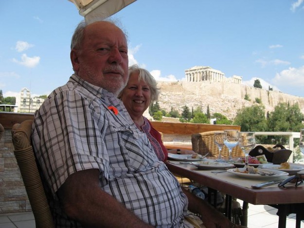 We made it to Athens and are having a Greek lunch before a trek to the Acropolis that you can see in the distance.