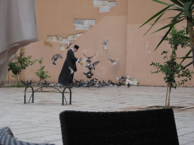 Greek Orthodox priest feeds the pigeons in Corfu