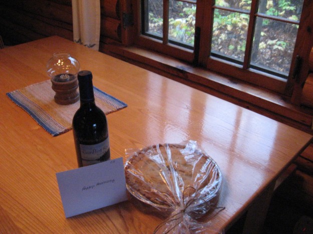 waiting for us in our cabin -- the romantic special included a bottle of Gunflint Red wine and they also gave us a blueberry pie since I said (on facebook) that my brother remembered the blueberry pies -- still a specialty of the Lodge.