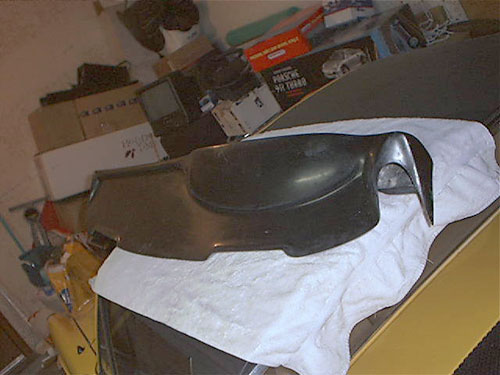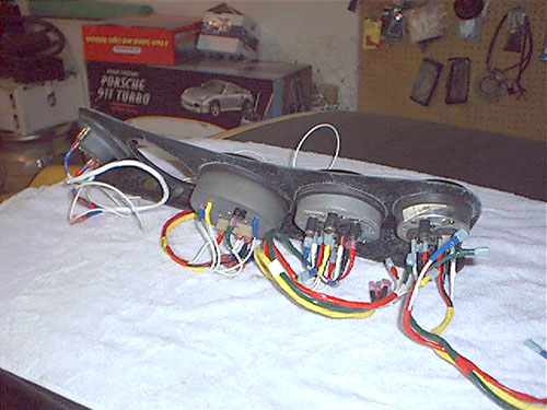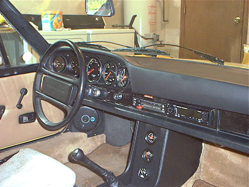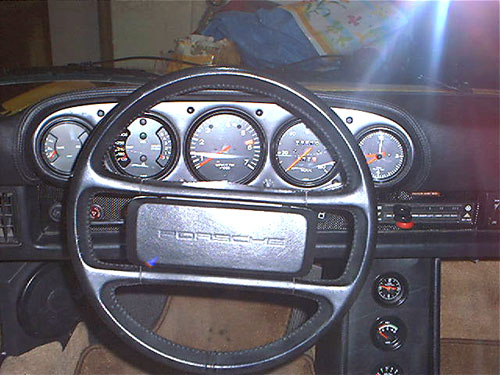 A. Landt February 16, 2004 This is a collection of pictures and information for anyone who is interested in a more functional, better looking 911 style dash for their Porsche 914. A while back I started to look for information and found very little. So I decided to just "Go for it" and see what happens. My 914 dash was very cracked. Though I had a nice dash cap on it, I still wanted to fix the cracked dash. 914 dashes that are not cracked can be quite expensive. I noticed information on a company called "Getty Design" that did a fiberglass 914 dash that looked just like a 911 dash. Since I am not an "Originality" freak I really liked the idea. Once I get the dash it will need finishing. I have a great local upholstery place that does excellent work. He was able to perfectly cover the dash in leather with hand stitching for $375. He told me he could have done it in vinyl for $150. But If I am going this far, it has got to be done in Leather. The 914's three gauges are a perfect fit on the 911 dash. So I knew I could keep the Speedometer and Tachometer. The fuel/temp gauge would fit just fine, but I wanted the 911 temp/oil pressure gauge. I noticed that the 911 fuel level sender is identical to the 914s. So the fuel gauge of the 911 should be a direct fit and work perfectly. Then I would also need a clock. Hey I like the 911 clock. I can retrofit the oil pressure gauge with my smaller VDO unit and make that work, just like I had done with the Temp gauge in my 914 before. VDO gauges are all great, they use the exact same parts and are customizable very easy. So swapping gauges to match senders is a snap. The only gauge I do not need is the oil level gauge. Maybe I will retrofit it for a volt meter. But for now I will ground a 100 ohm resistor to its sensor prong and make it look like it functions. The final costs of my extra gauges and retrofitting came to $150.00. So the final cost of this addition came out to just a little over $850. Not bad for the end results. If I had done in in vinyl and gone with cheaper gauges it would have only cost around $500.