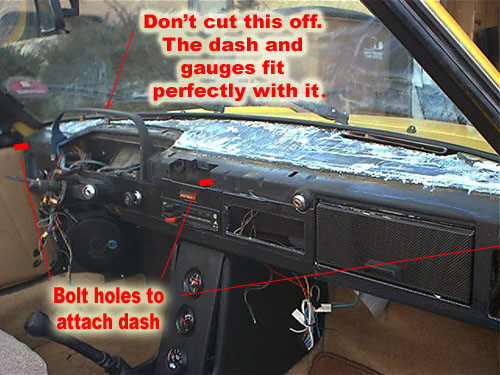 After a bit of stretching and bending I was able to get the original 914 dash out. The hardest part was the three tiny screws that hold the ash tray on. Those suckers are hard to get at. Even harder than the 914 dash mount nuts. I did not want to cut it off so I worked at it, bled a bit and finally got it off in one piece. After a quick test fit I noticed that it went in perfectly and fit perfectly, even with the windshield still installed. I noticed that there were three perfect places that the getty dash lined up with that had holes on the 914's dash plate. I decided that I would drill three holes in the getty dash and insert self locking bolts. These are the bolts that dig into one side so you can tighten a nut to the other side without having to hold it. Trust me there is no way to do it any other way that I could see. I had no idea how I would attach the windshield side. But once I tested with the three bolts in the front, I noticed it was very solid. So I took it out and put in some really sticky double sided molding tape to the dash near the windshield and re bolted it into place. This dash is not going to move. I have read a few places that people find the gap below the passenger side of the dash odd. You can reach up and under the dash in this area, but you cannot see it unless you turn upside down and look up or are 2 feet tall. Actually I noticed that is it nessessary so you can lock the glove box and get to the radio. As well when installing the dash, that open area was a blessing. It made attaching the dash so much easier.